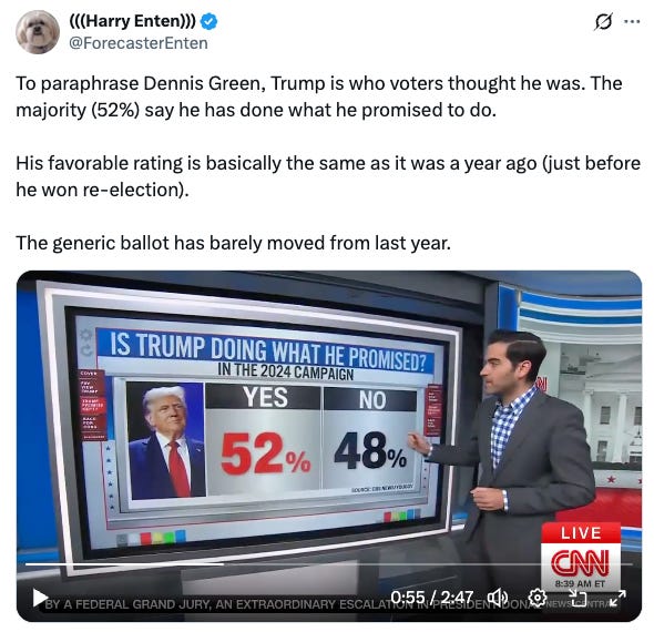 For all the talk of a dramatic shift in public opinion, most voters believe that Trump has delivered on his promises and the generic ballot has barely moved from last year.