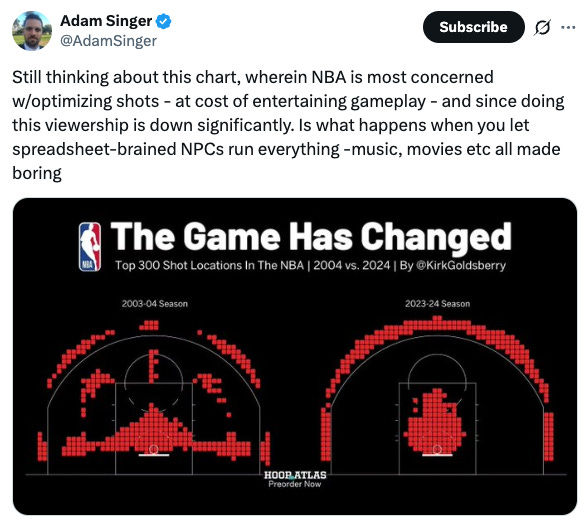 How quants ruined the NBA: They figured out how to maximize shot efficiency — at the expense of creating an interesting game people want to watch on TV.