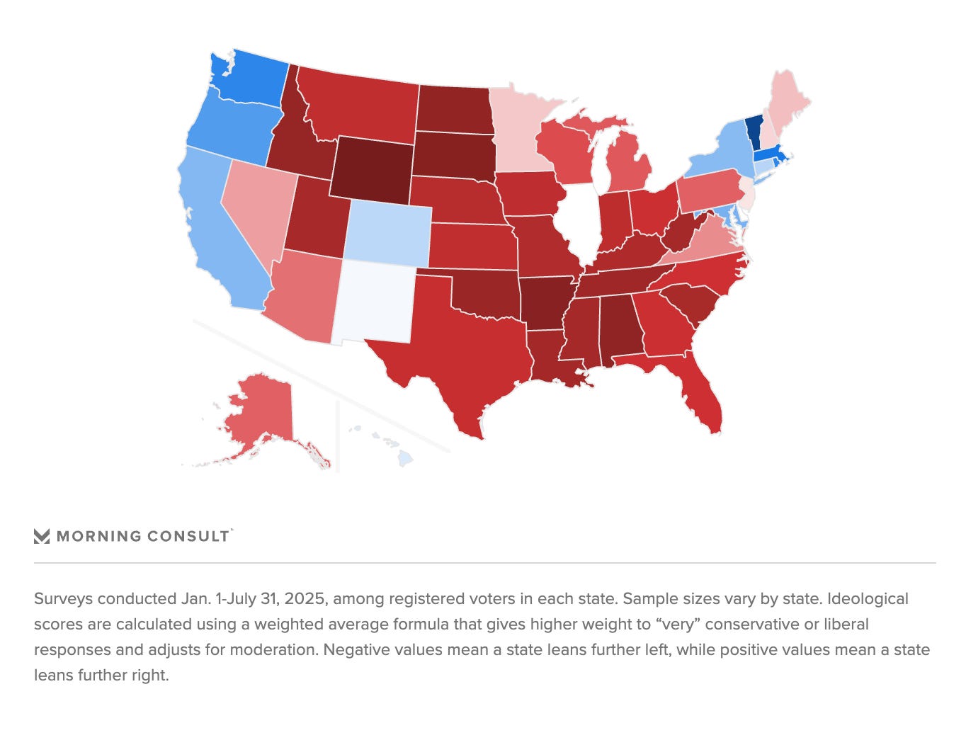 Morning Consult maps political ideology in all 50 states, with conservatives outnumbering liberals in 38 states and in all the presidential battleground states.