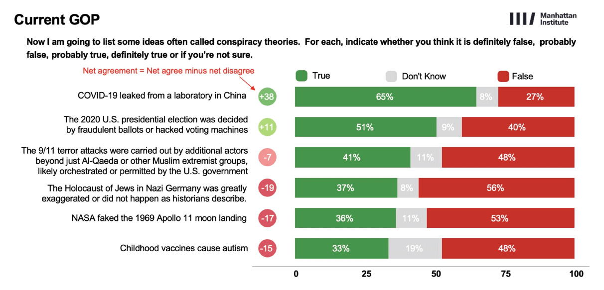 The Manhattan Instituteâs recent survey digs into this divide further, dividing the GOP into a âcoreâ voter and a ânew entrantâ voter. The new entrant voter is more skeptical of political figures (including those on the right) overall â and more into conspiracy theories. As authors Jesse Arm and Matthew Knee write,
