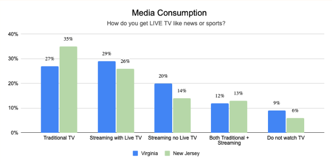 A survey by the Center for Campaign Innovation finds that 50% of Virginians and 40% of New Jerseyans use only streaming services for live content, with many never watching live TV at all, requiring campaigns to adapt their strategy to these âcord never,â disengaged voters.