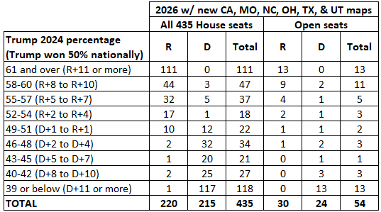 The 2026 cycle is shaping up to have one of the lowest numbers of House incumbents seeking reelection since World War II, with 54 open seats already on the books and more likely to come. But these vacancies are overwhelmingly happening in solid blue and red districts, Kyle Kondik writes. More Republicans are retiring than Democrats, a harbinger of a difficult midterm cycle for the GOP.