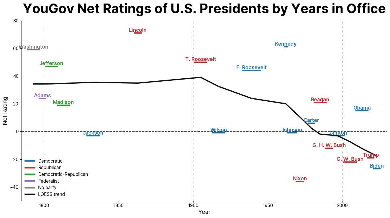Using ChatGPT, I created this chart of YouGov data of past presidential approval released around President’s Day. I am less interested in the approval of various presidents on their own than in the trend of the presidents of the distant past being more well-remembered than recent ones. Or, on the flip side, presidents more closely tied to present-day political alignments seeing their popularity still bogged down as a result. Across the 20th and 21st centuries, the trend is linear: the further in the past you are, the more popular you are. This helps us see presidential popularity in the context of this temporal bias.