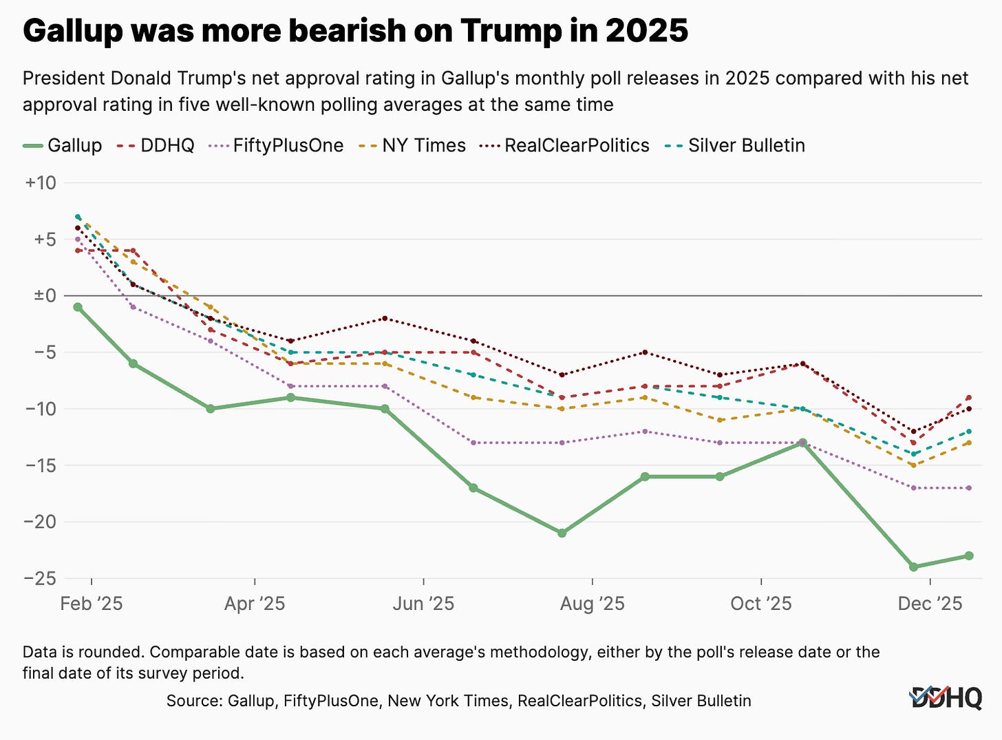 The immediate numerical impact on polling averages will be modest, since approval is one of the most-polled questions in American politics. But Gallup’s departure isn’t without consequence. The firm had been a consistent outlier on the low end of Trump’s approval numbers during his second term, so its absence could nudge aggregate averages slightly upward. More broadly, it ends a nine-decade continuous time series that has served as a foundational benchmark for understanding public attitudes toward the presidency.