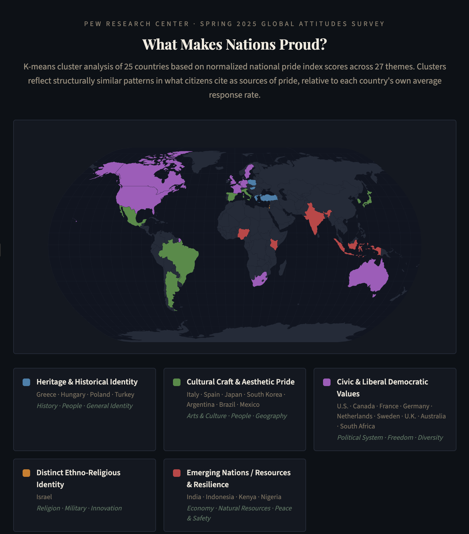 In another quick exercise of AI-assisted data analysis, I told Claude to extract data from the topline into a single table for easy reference, and then conduct a cluster analysis grouping countries by shared sources of pride. Then I told it to visualize these groups on a world map and it gave me this.