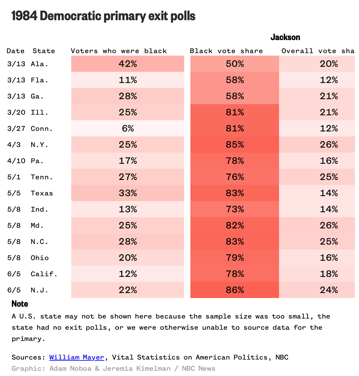 Jackson was able to secure a solid block of pledge delegates in both 1984 and 1988 primaries thanks to strong support from Black voters. Voting was highly racially polarized at the time and Jackson received few votes from whites. A bit of lore is that the decline in Bill Clinton’s standing among Democrats came when he likened Barack Obama’s performance in South Carolina to Jackson’s, who was seen as more of an identity politics candidate than Obama, who had succeeded in building a cross-racial coalition.