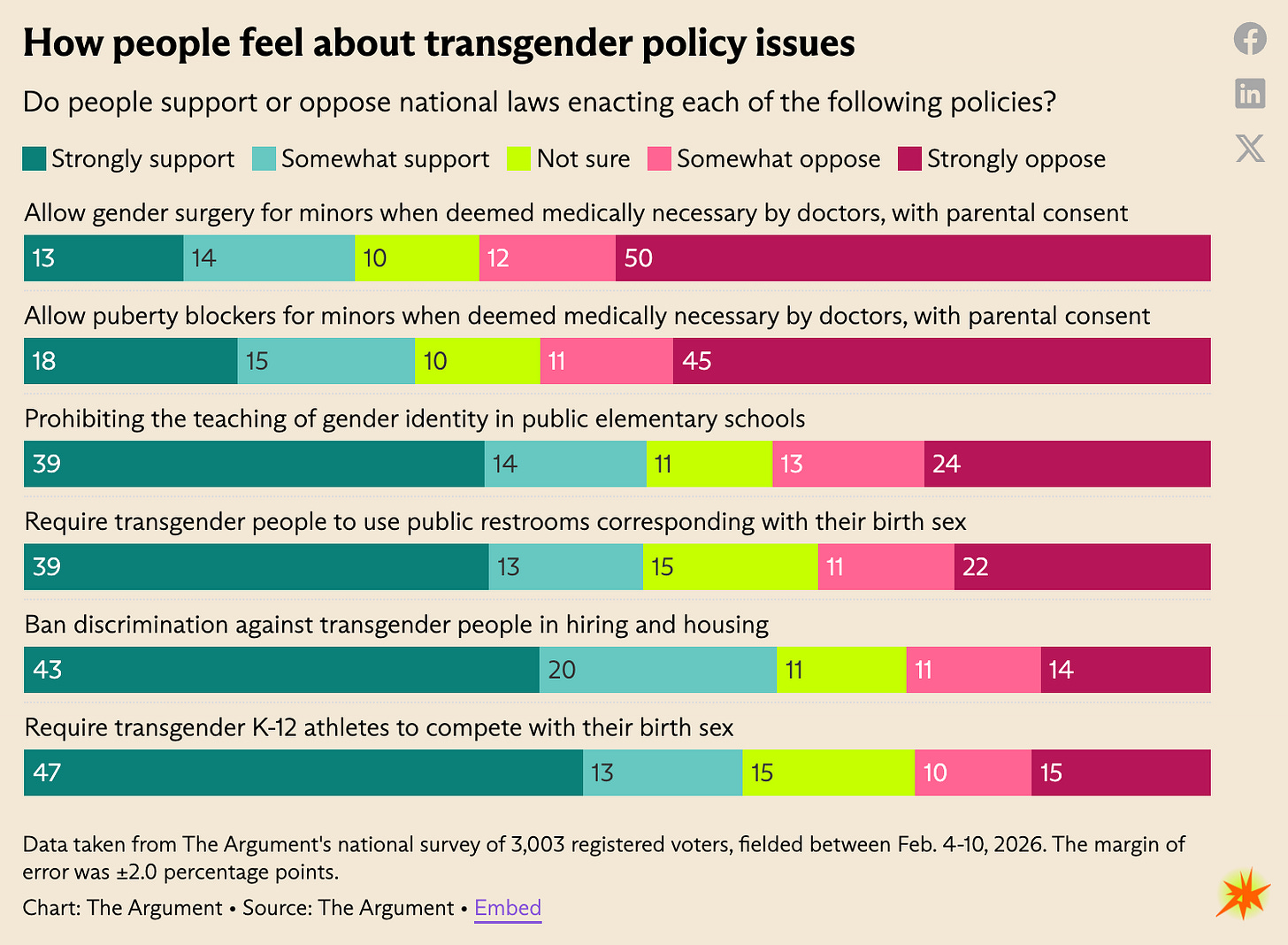 New polling from the liberal publication The Argument finds a shift in a more conservative direction when it comes to transgender issues. A recent poll found that 52% of voters a support laws that restrict transgender people to using bathrooms that match their birth sex, a reversal from a decade ago. However, voters still overwhelmingly support laws banning discrimination against transgender people in housing and employment.