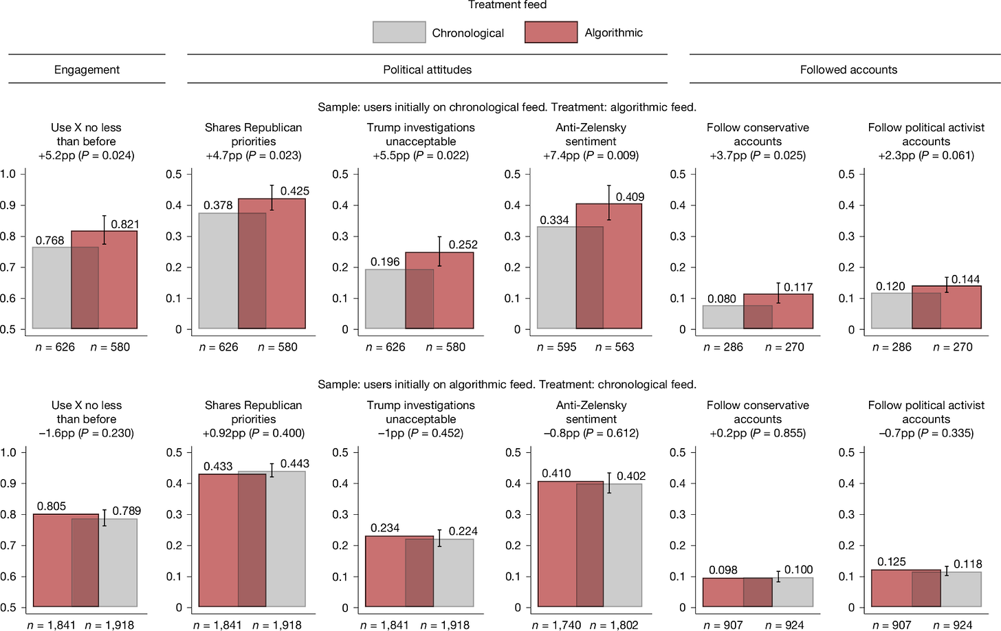 Switching from a chronological to algorithmic X feed pushed users to be more conservative. Going from an algorithmic back to a chronological feed had no effect. The feed switch had a greater effect on Republicans and independents than Democrats.