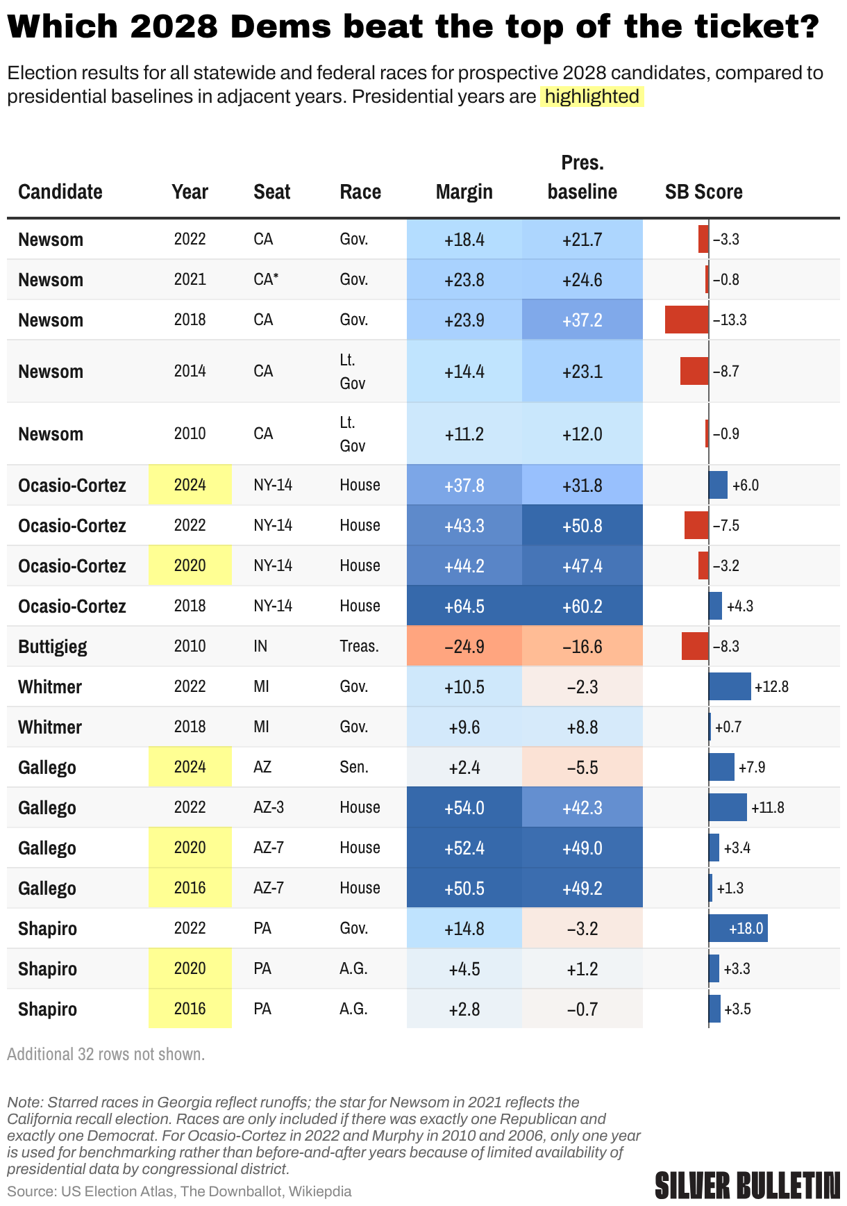 Nate Silver built a simple metric “SB Score” comparing each Democrat’s election margin to the presidential baseline in their state. The results: Gavin Newsom has consistently underperformed Democratic presidential candidates in California. Newsom has rocketed to the top of Democratic primary polls by cultivating an image as the Dems’ Alpha, but he’s actually one of the weaker options electorally.