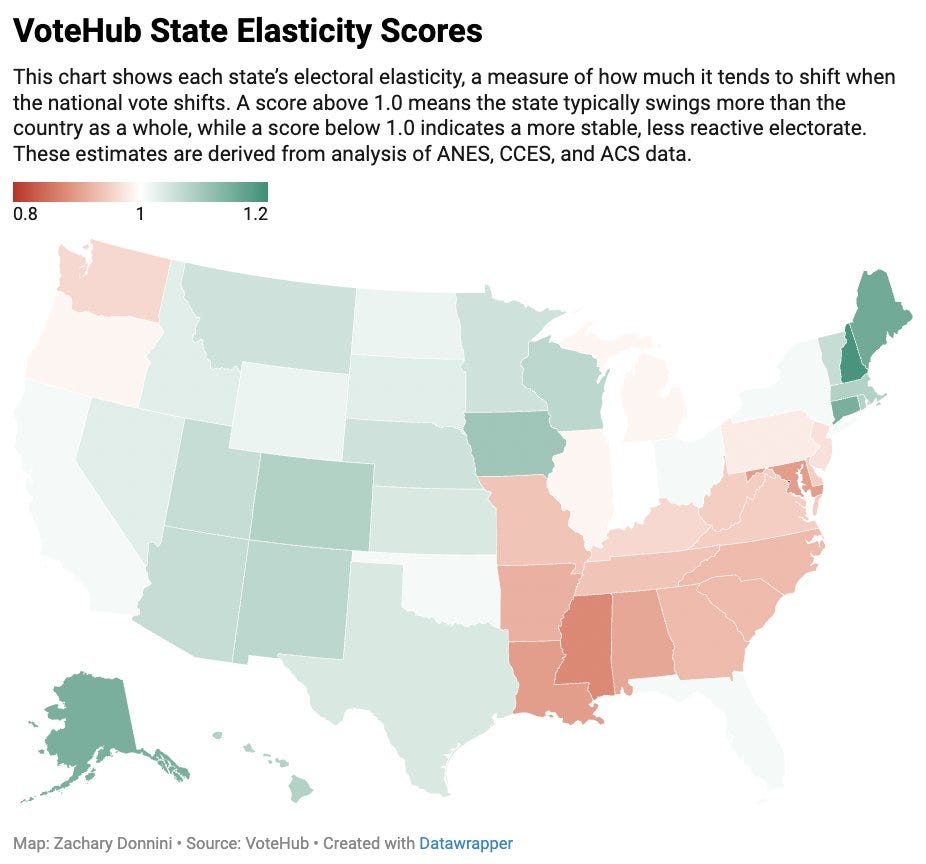 Zachary Donnini previews VoteHub’s state elasticity scores. Elasticity measures the degree to which individual states swing more or less than the national average. With their racially polarized electorates, regions like the South swing less, while New England and the West tend to swing more. While the key Senate states year tend to be red states, a number of them like Alaska, Iowa, and Maine are high elasticity, making for more variable outcomes.