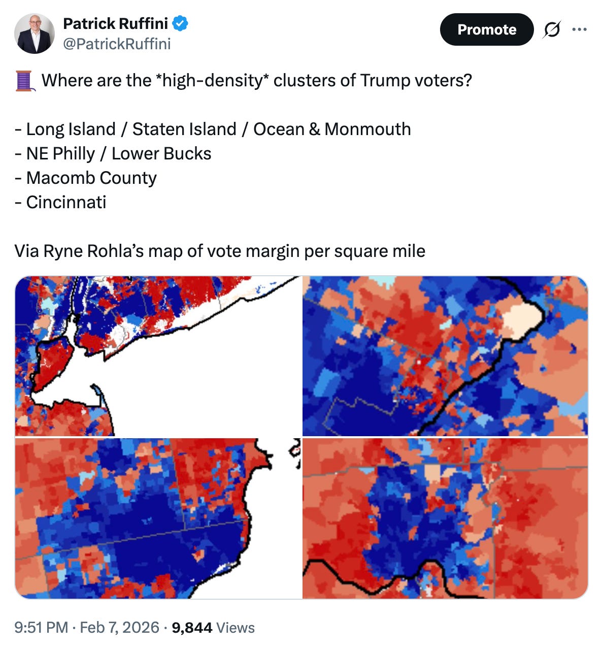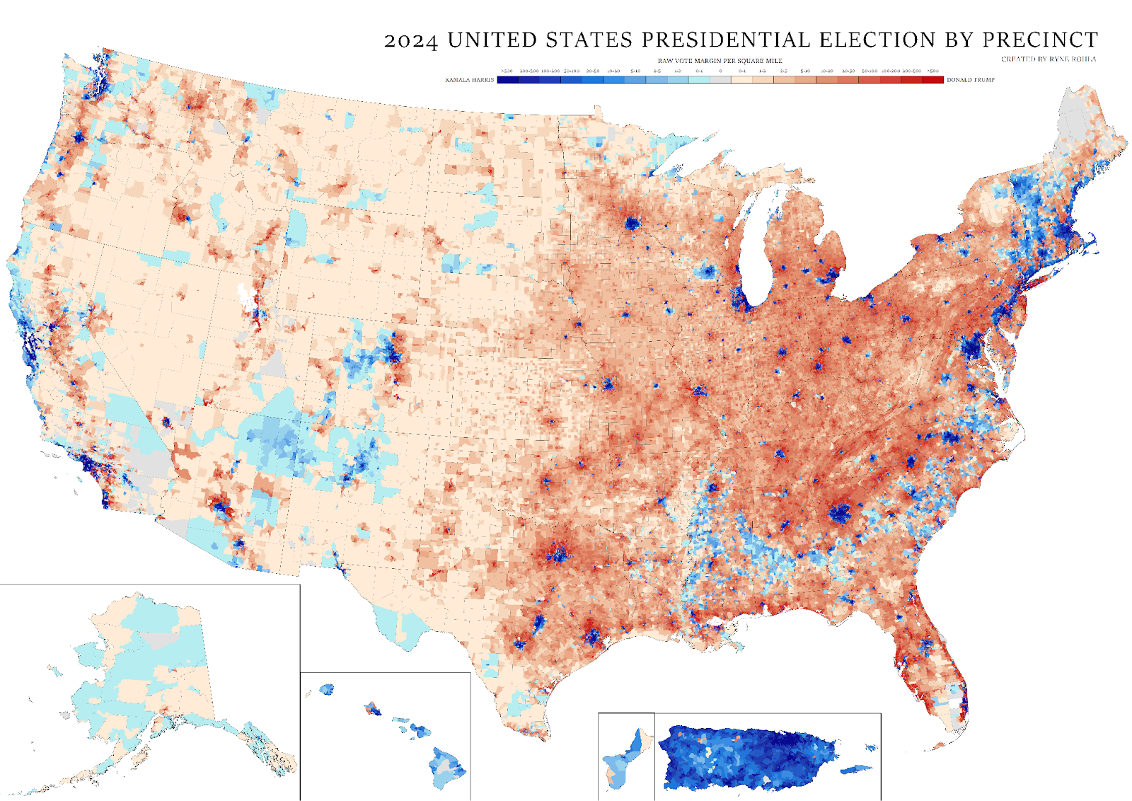 From cartograms to density-shaded maps, I’m not usually a fan of alternative types of election maps. But this insanely detailed map of 2024 election margins by square mile by Ryne Rohla is proving to be the exception. We all know that denser areas tend to be blue and more rural areas red. But what’s interesting about this map are the exceptions: look at the dense Republican areas (dark red) or the less dense Democratic ones (light blue). Outside of tribal areas, the Black Belt, and the West Coast, Madison, Wisconsin really is an outlier in playing host to a lot of Democrats in its rural outskirts.
