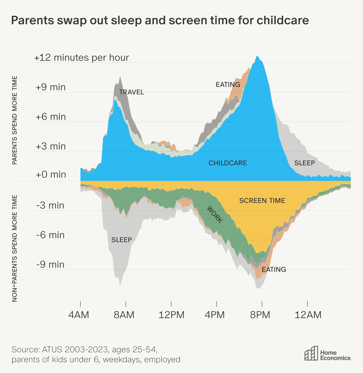 After you have those work-from-home babies, parents primarily fund their childcare hours by sleeping less and cutting screen time, rather than reducing work. Despite this tradeoff, parents report higher life satisfaction than non-parents. The biggest childcare demand hits in the evening (around 8PM), exactly when non-parents are unwinding with screens.