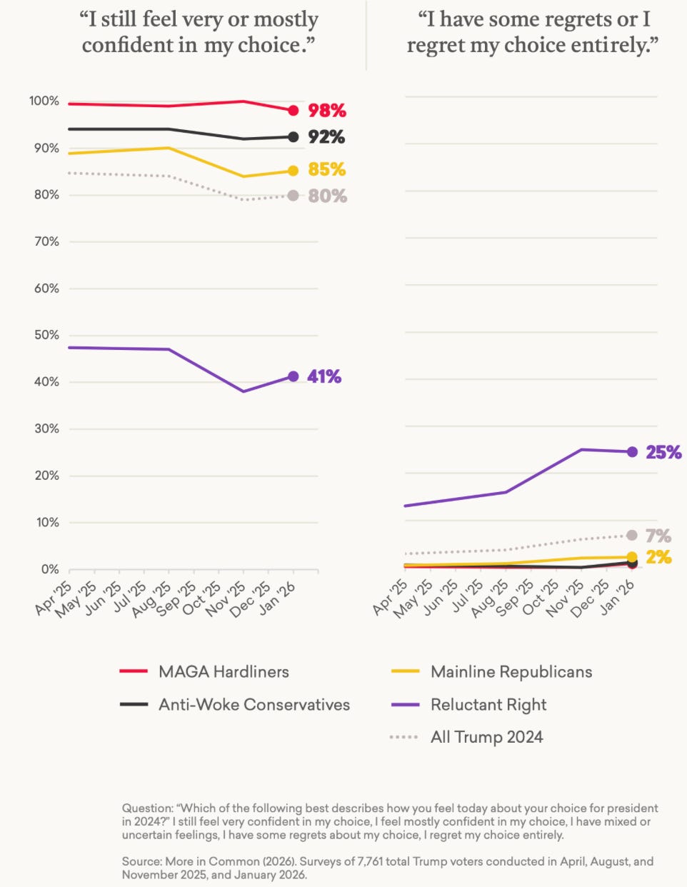 Going back to the Trump coalition, More in Common has released a typology of the four distinct types of Trump voters; MAGA Hardliners (29%), Anti-Woke Conservatives (21%), Mainline Republicans (30%), and the Reluctant Right (20%). Like our own political tribes quiz, you can take their quiz to see which you are if you’re inclined towards the right.