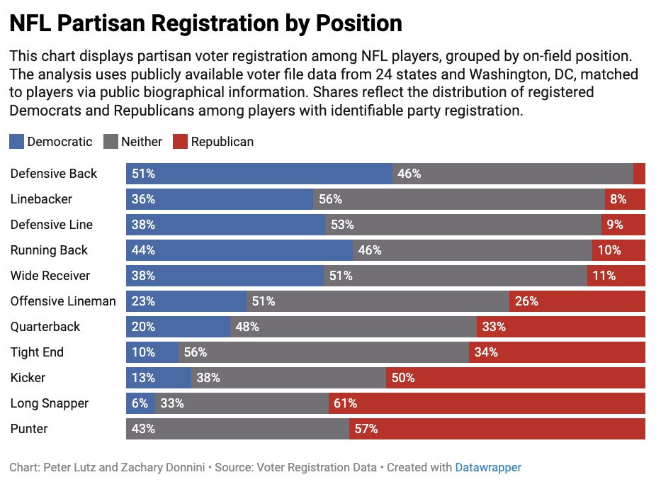 If you think this tells you a lot about racial makeup of each position — you’re right. And if you think you can see Cooper DeJean on this chart, you’re also probably right. The implication here is that white male athletes are a very Republican group — less than 10% are registered Democrats in states with party registration.