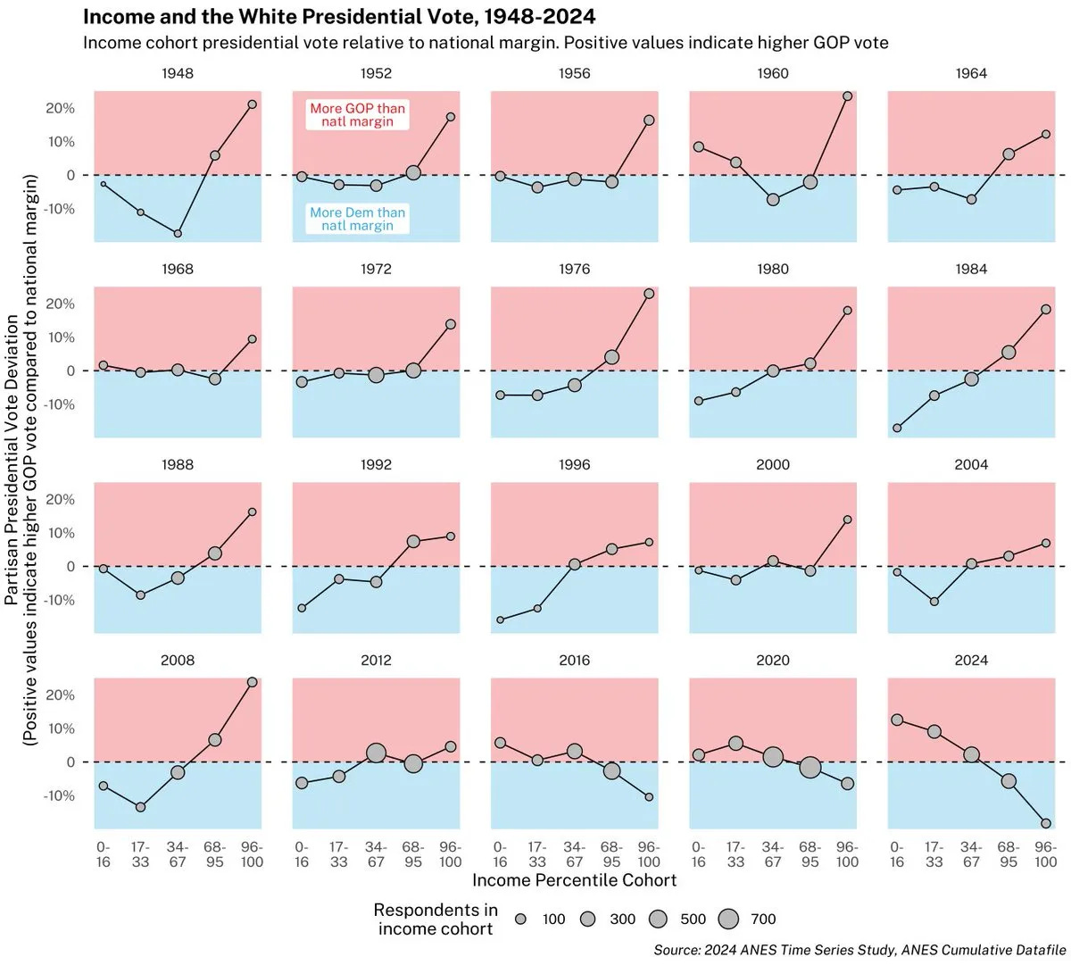 I led off talking about The Tom Wood Chart (a coinage I hope sticks) in Party of the People, and the 2024 update is even more dramatic. Among whites, income is even more negatively correlated with Republican voting than ever, a complete reversal of the 20th century pattern where Democrats were well and truly the party of the working class.