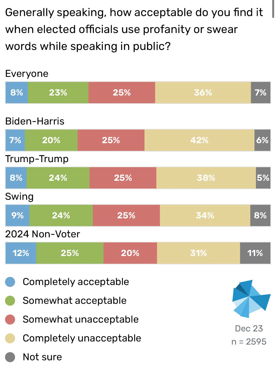New polling from David Shor shows that politicians who swear to convey passion and authenticity may want to rethink that choice. All voter groups — especially those in the rule-following Democratic coalition — find swearing by politicians unacceptable.