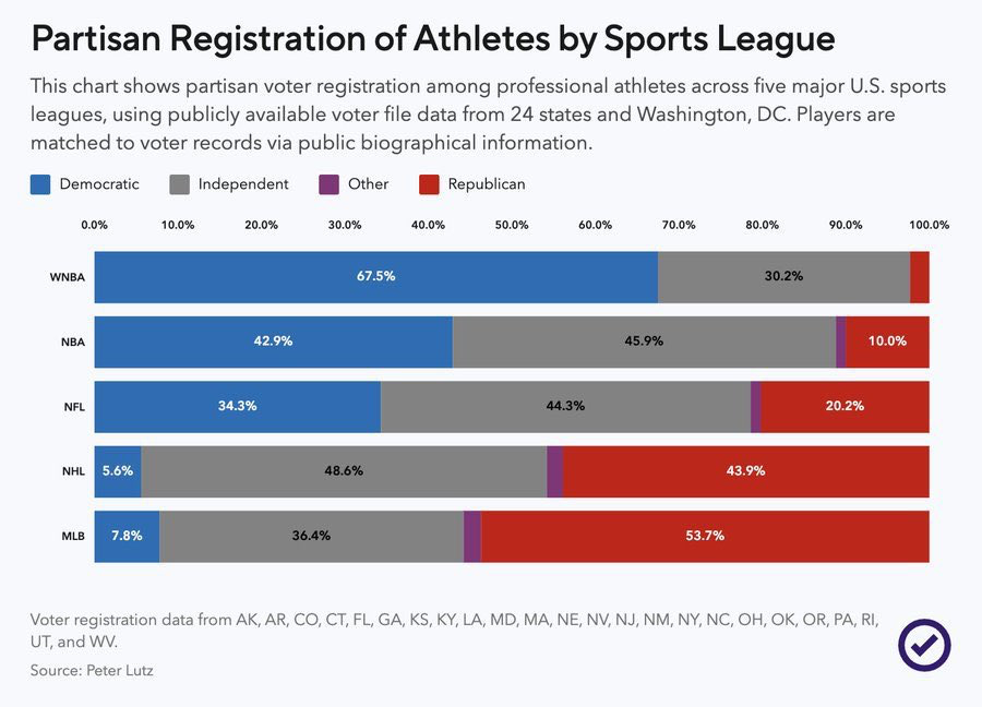 According to voter file research from VoteHub, partisanship differs a lot between sports leagues with Democrats holding a whopping 68-2 advantage among among WNBA players and Republicans a 54-8 advantage among MLB players.