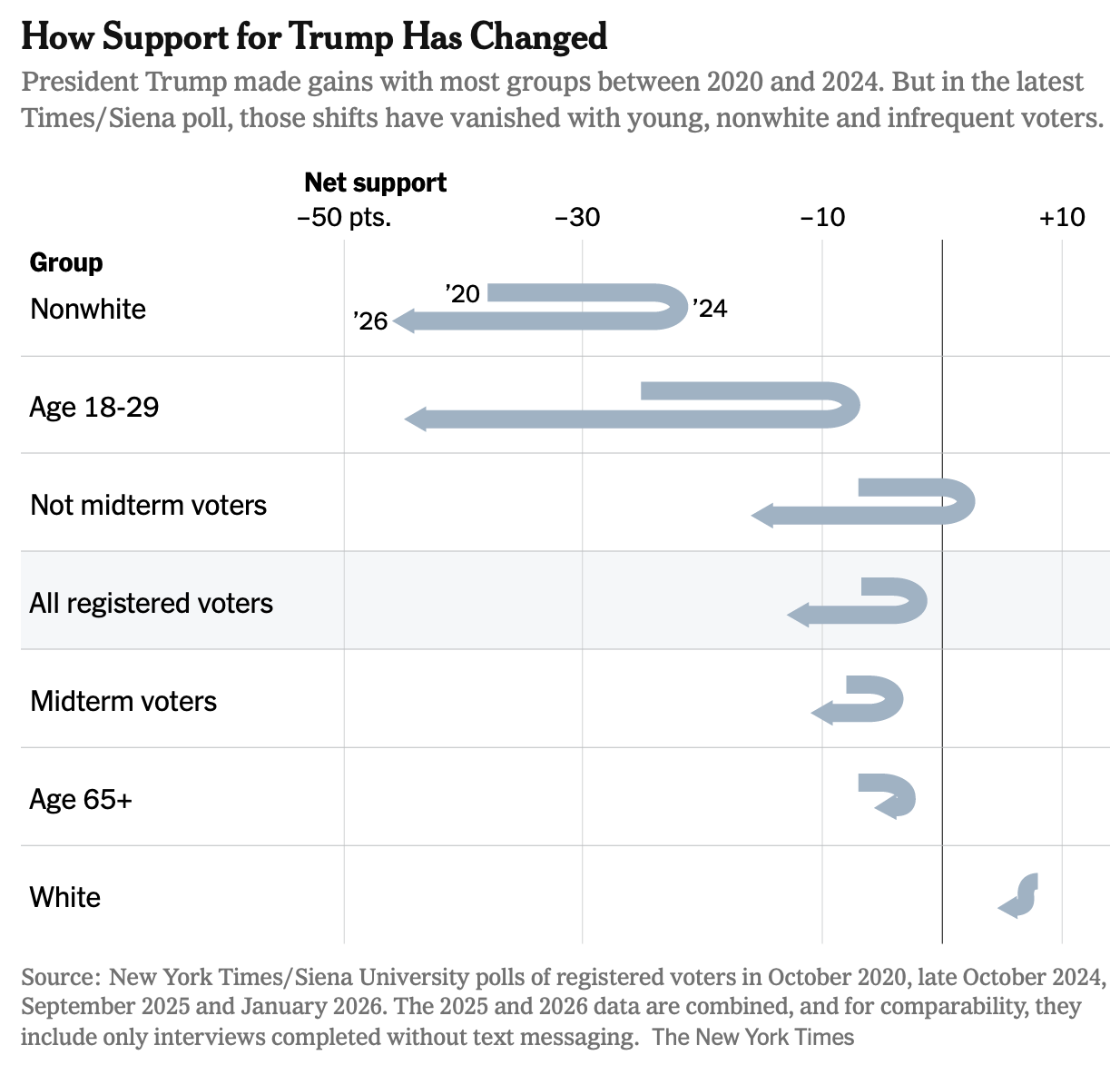 In 2016 and 2020, Trump realigned a lot of voters — white and nonwhite — who were better aligned with a populist and traditionalist vision of America but who previously voted Democratic. Those gains appear to be durable. If you want to compare 2026 to 2018, let’s compare demographic support levels in that election to this one as measured by the NYT/Siena poll, as Ryan Girdusky does in his excellent National Populist Newsletter: