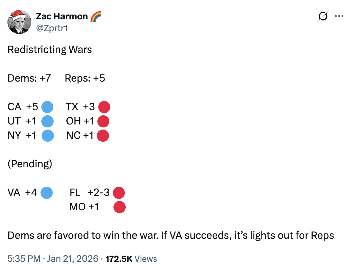 Speaking of redistricting, we’re now talking about a Democratic advantage from mid-decade redistricting (particularly if laser-eyed Louise Lucas gets her way). I thought any party getting an advantage from gerrymandering was a “five alarm fire for democracy” — but here we are. For the GOP to get back to even or better, it’ll take Florida moving (more likely) or an early SCOTUS decision striking down Article 2 of the VRA (timing makes it more of a 2028 prospect, but a major GOP advantage if and when it happens).