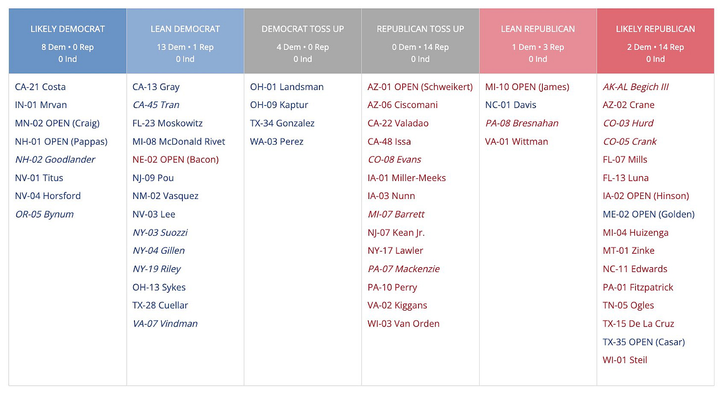 The new Cook Political Report ratings (🔒) show Republicans need to win 67% of the 18 toss up House seats to maintain their majority — seats that are largely unaffected by the largest wave of retirements since 1974. The ratings also showed that while Democrats are enthusiastic, they lack a clear brand or leader, and they have almost no chance of taking the Senate, setting the stage for another split Congress.