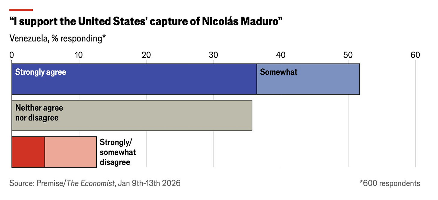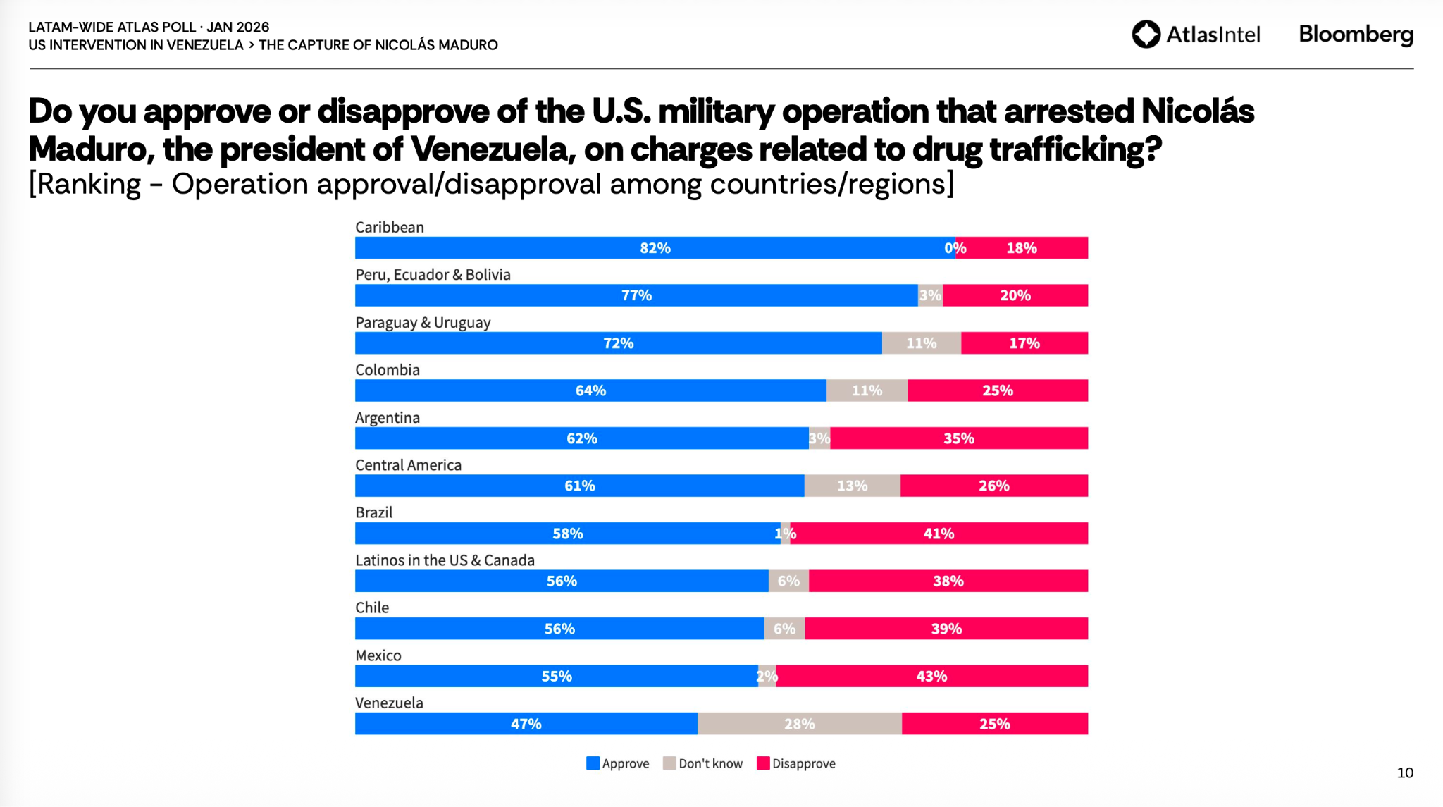 And an AtlasIntel/Bloomberg poll finds the operation overwhelmingly popular throughout Latin America. What distinguishes Venezuela proper from the rest is the large number saying they are unsure, a telltale sign of respondents censoring themselves in a dictatorship.