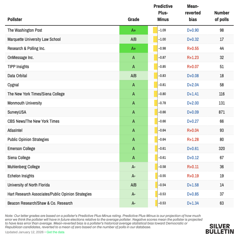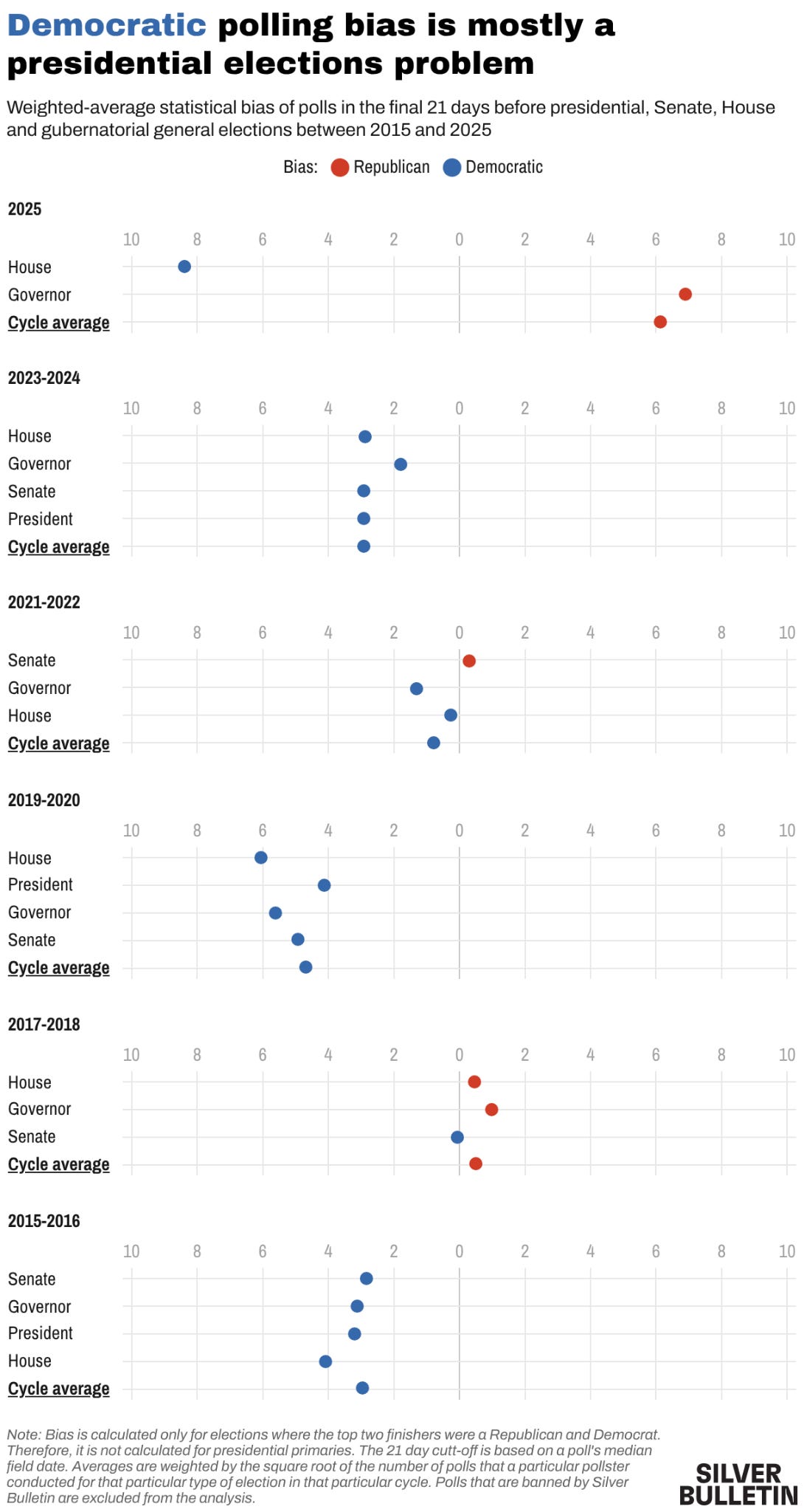 Eli McKown-Dawson has a further write-up of these rankings reminding us that polls can miss on both sides, underestimating Democrats in the 2025 off-year elections. But recently, when polls have missed, it’s been a presidential election problem.