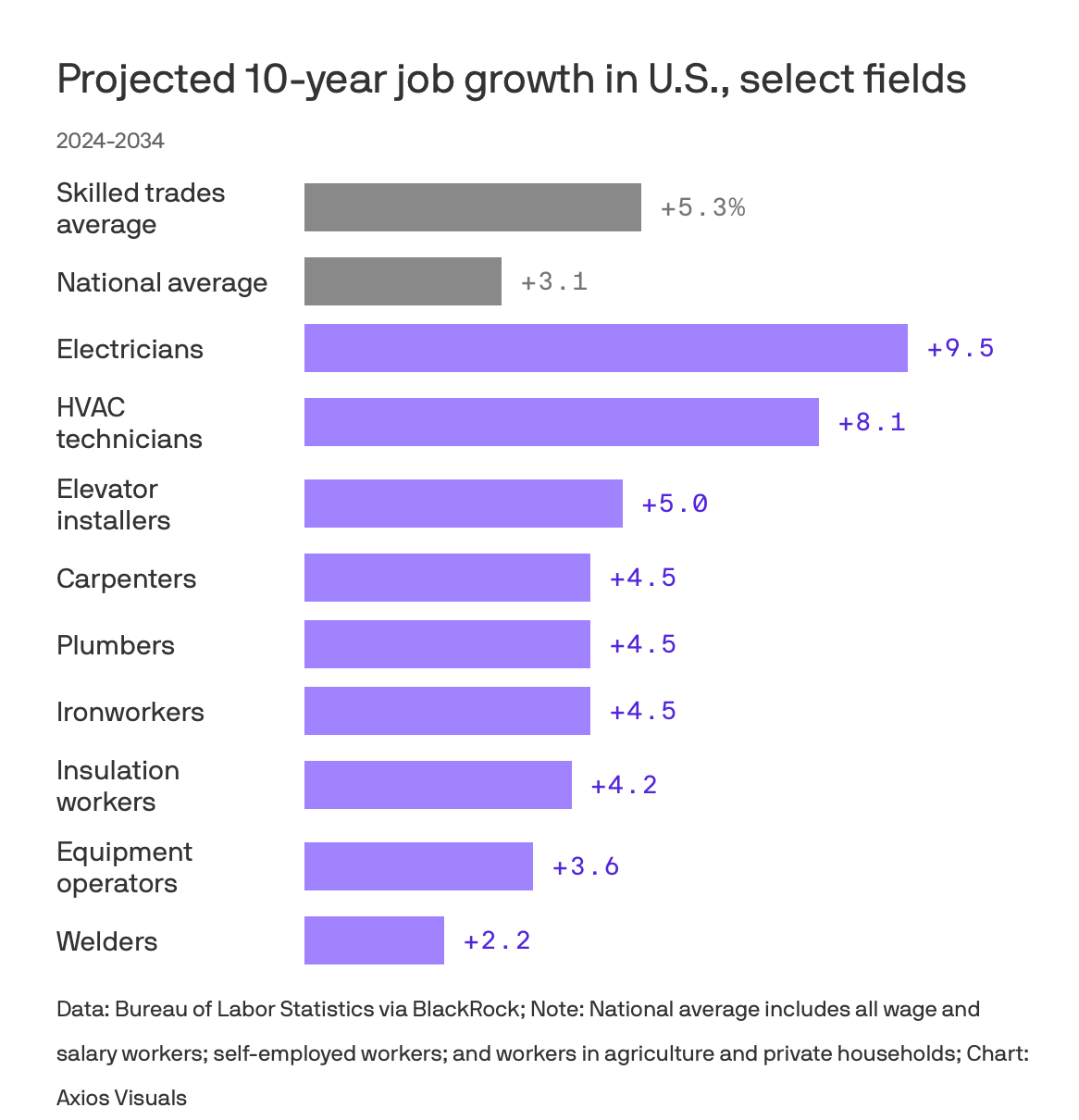The news isn’t all bad for the job market. BlackRock predicts a construction boom with infrastructure-related jobs projected to grow at least 5% in the next 10 years, much of it fueled by the AI data center boom. Will this lead to a lasting shift from white collar to blue collar employment?