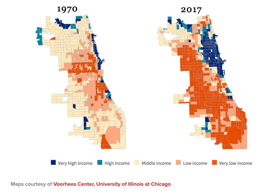 What’s happening in Chicago is happening in other large cities: cities are growing more and more unequal, with more of their territory home to the very rich and very poor with little left in between.