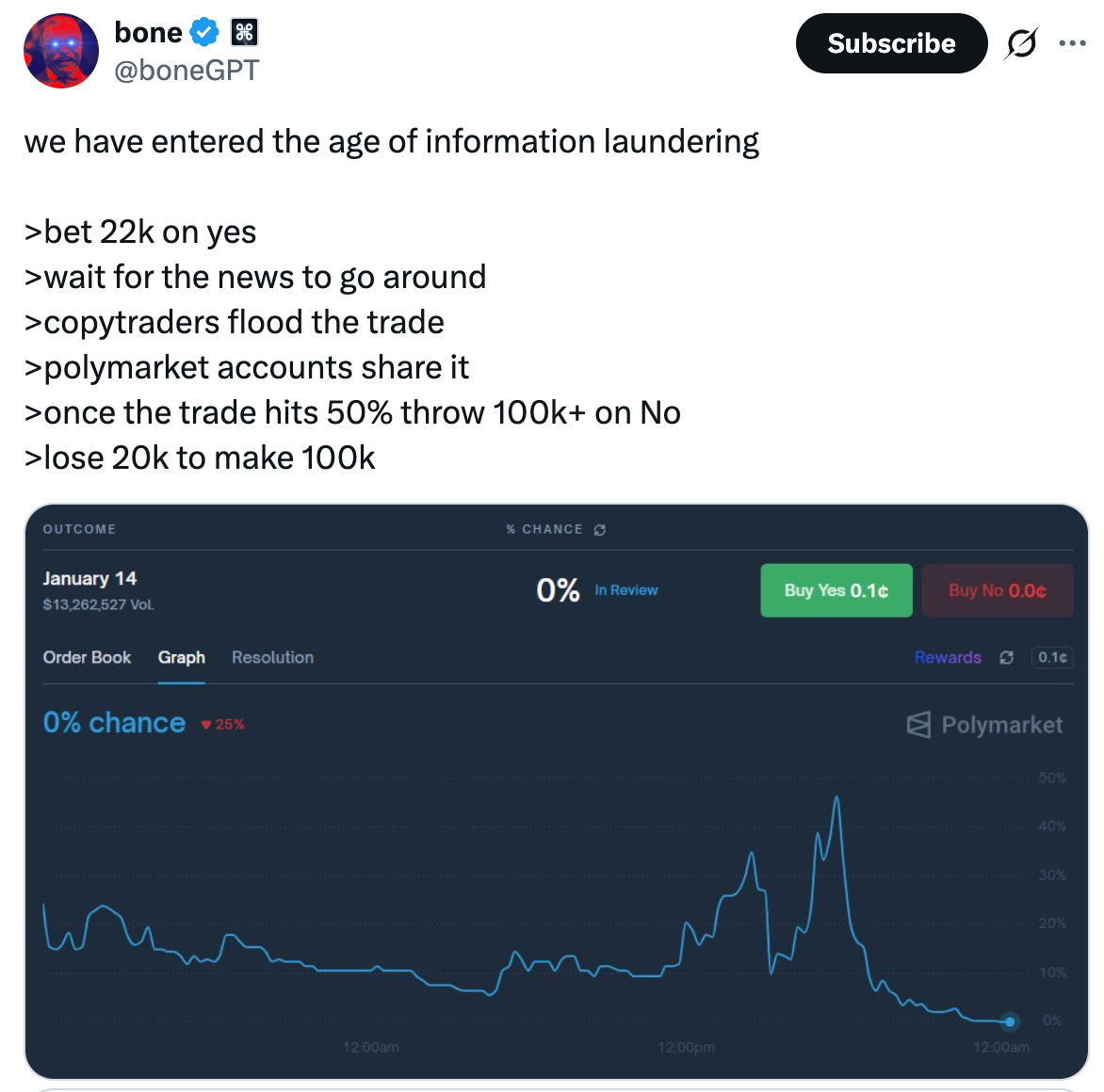 We all know about the mysterious Polymarket whale who profited last week betting on the deposal of Nicolas Maduro hours before the U.S. raid. When someone this week plowed a lot of money into a weirdly specific bet on a U.S. strike on Iran happening January 14, traders were on alert and bid up the price. But the raid didn’t happen. The original bettors and their copycats lost it all.