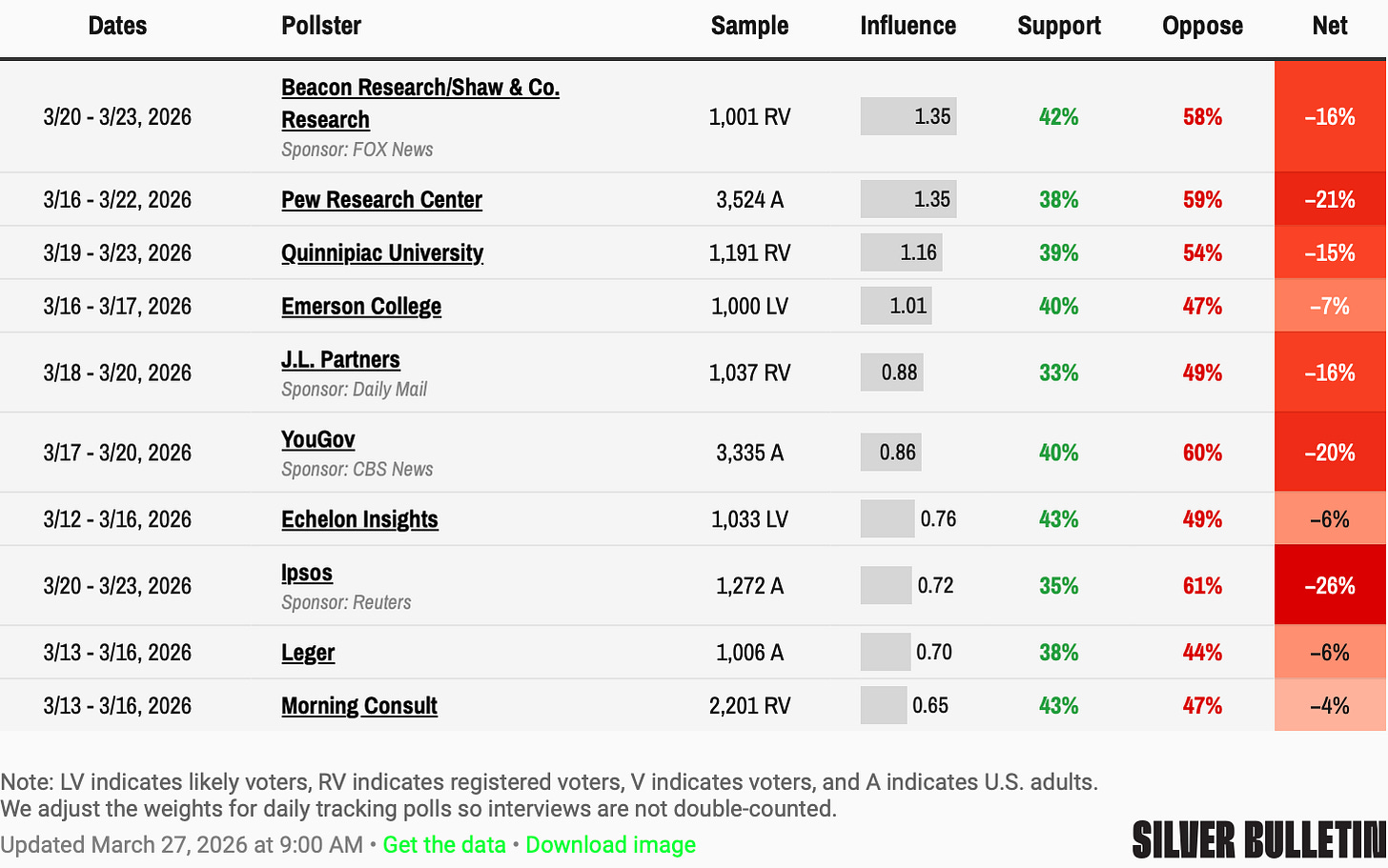 Silver Bulletin has begun tracking approval of the Iran war — showing a further dip in support for the war in the last week.