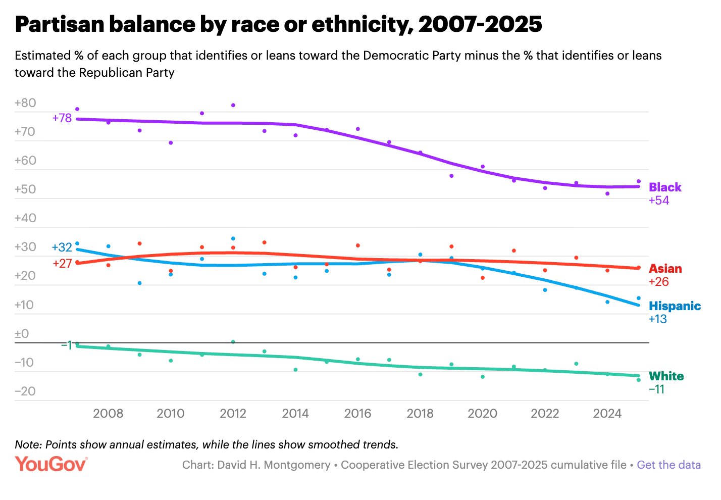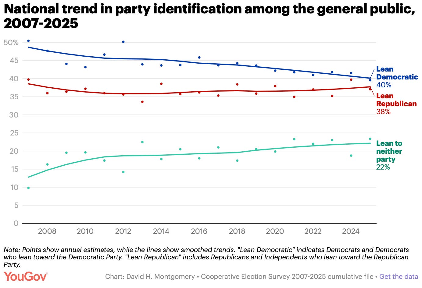 YouGov’s deep dive into the Cooperative Election Study — which has interviewed 60,000 Americans in every even-numbered year since 2006 — shows a consistent decline in the share of the electorate identifying as Democratic, now down to a near-even break with Republicans.
