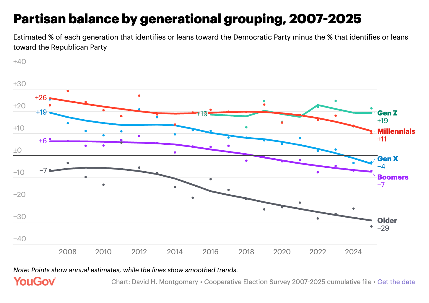 This is a trend I wrote about right after the 2024 election, except that in exit polls, Republicans actually outnumber Democrats and have since 2020. But it’s good to have a longitudinal dataset with solid subgroup breaks on party ID to do this analysis on. These trends by group confirm that the trend has been consistent across generations, with all groups getting more Republican as they get older.