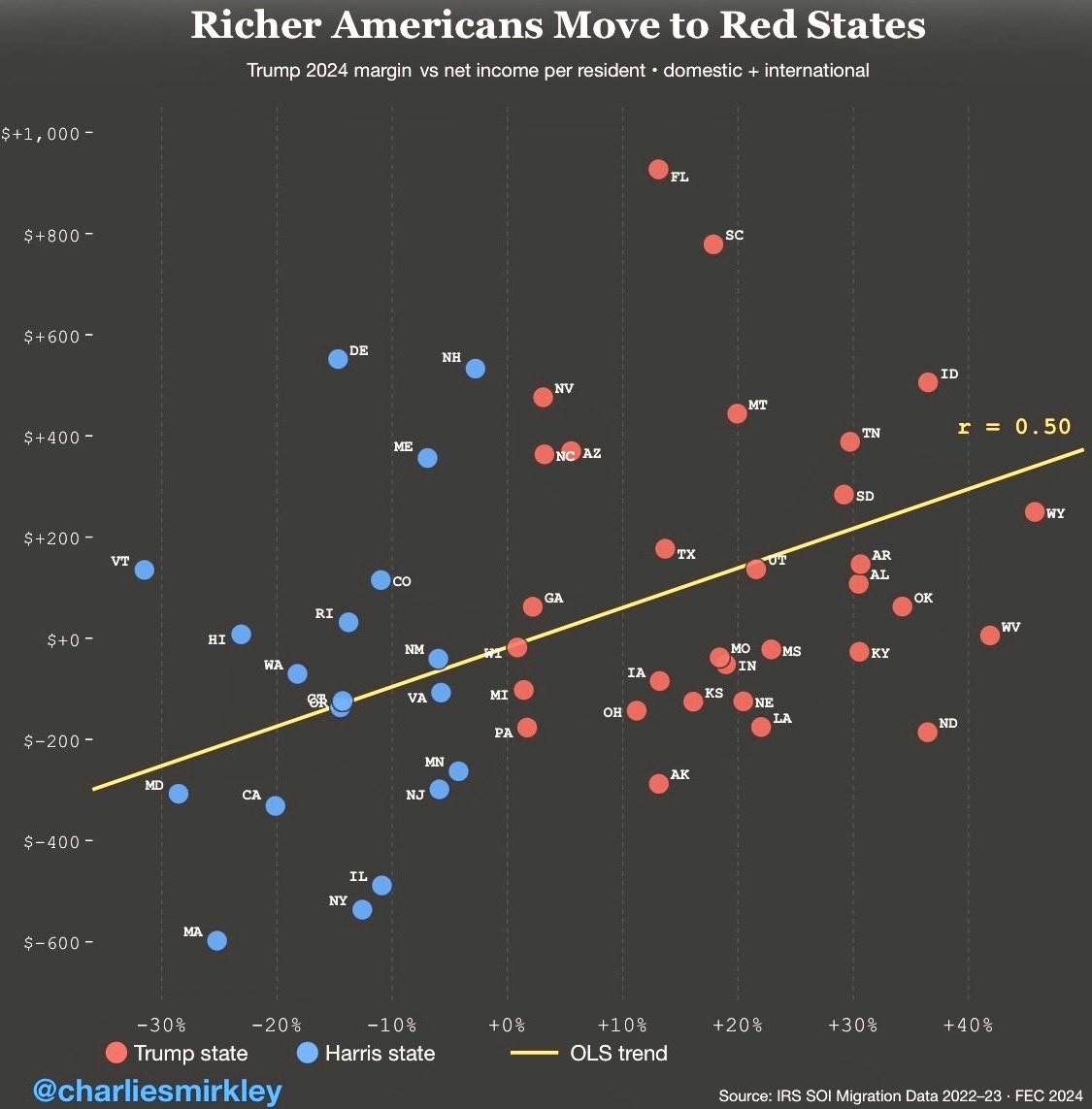 A widely circulated chart from Charlie Smirkley underscores the role taxes likely play in driving these migration patterns: the movers to red states tend to be higher in income, those to blue states lower.