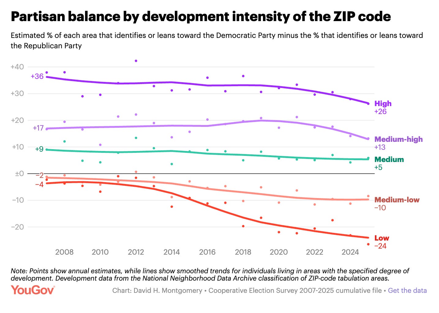 And the data also captures the growth in Republican identification in less developed areas — the Trump 2016 realignment — that’s only deepened since then.