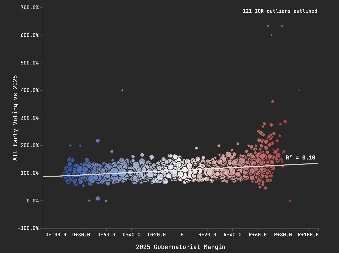 But Kyle Kondik points out that the modeled partisanship of early voters is exactly the same as it was in the very Democratic 2025 election — but all caveats about modeled partisanship apply here.