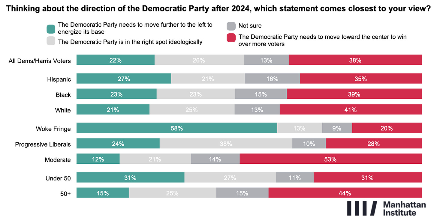 A new Manhattan Institute survey of nearly 2,600 Democratic voters finds a coalition that’s far more moderate than its loudest voices suggest. The party breaks into three blocs: Moderates (47%), Progressive Liberals (37%), and a “Woke Fringe” (11%) that takes consistently maximalist positions. Just 22% want the party to move further left while 38% want it to move toward the center. On issue after issue — immigration, trans policy, DEI, crime — the median Democrat looks nothing like the activist left that dominates the discourse.