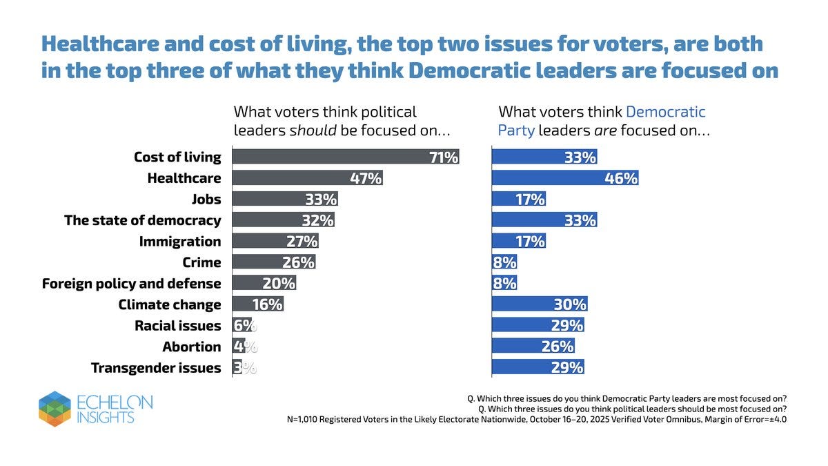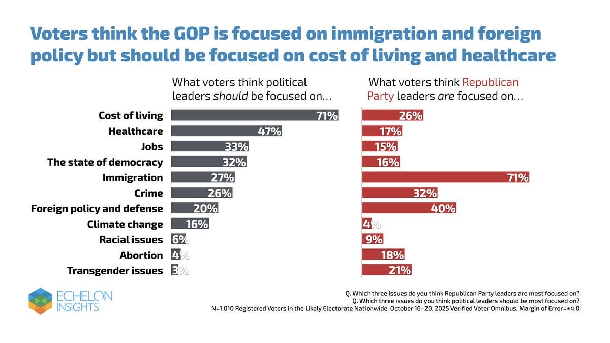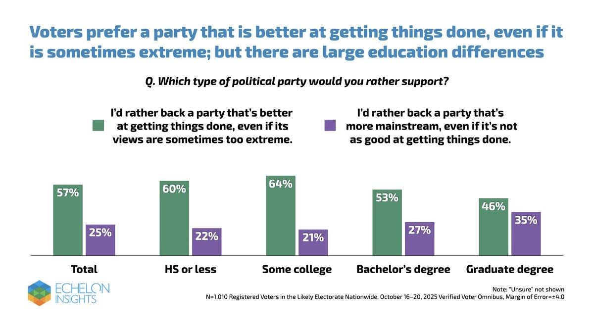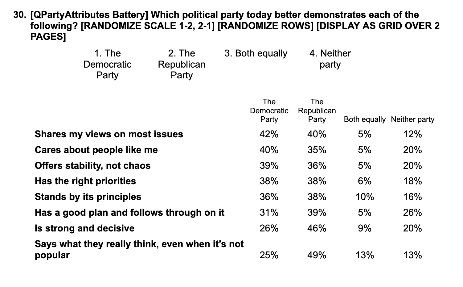 An important clue to why Democrats aren’t completely dominant lies in another question Echelon asked this month: which qualities do you associate with either party? And while Democrats are competitive or narrowly lead on some attributes — coming closer to your views, caring, stability, having the right priorities — where they fall short is on execution, where Republicans have a massive advantage on things like “has a good plan and follows through on it” (R+8), “strong and decisive” (R+20), and “says what they really think, even when it’s not popular” (R+24).