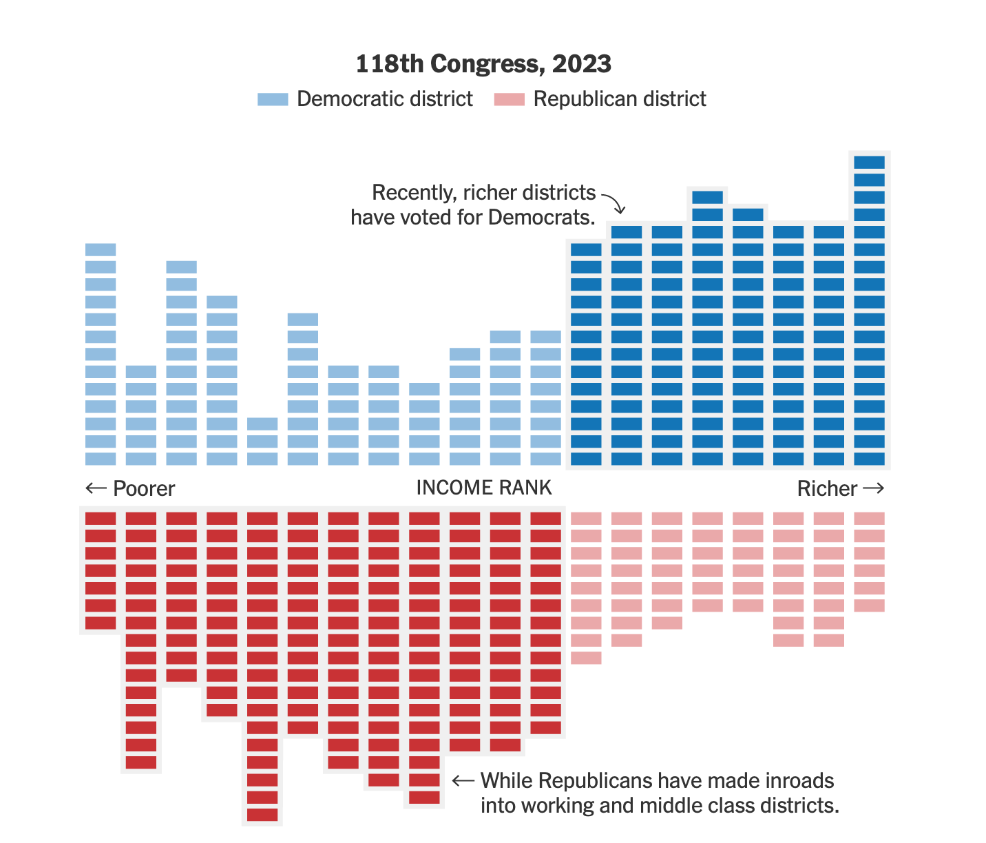 Despite Democrats still being somewhat identified as a party that cares and is aligned with voters on healthcare, the reality of electoral realignment continues to stare us squarely in the face. Brody Mullins brings together an impressive array of data to show that Democrats are now the party of the rich, representing two thirds of the the top quarter of districts by income.