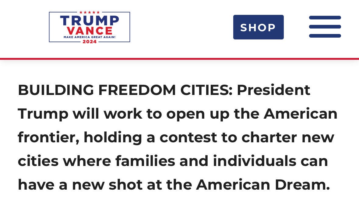 During the doldrums of the early 2024 Republican primary, Donald Trump released a bunch of oddly specific policy proposals. One of them was to charter ten new “Freedom Cities” on federal land:
