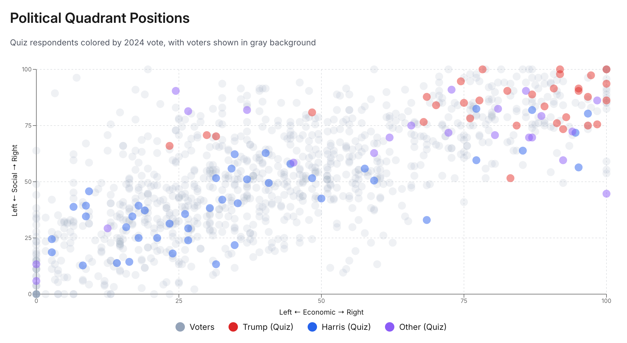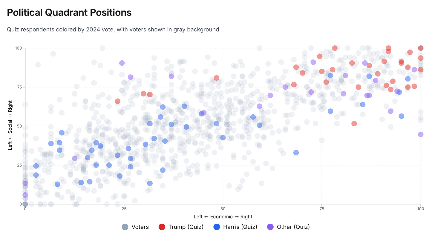 The quiz will take you through the same questions voters get, and map you onto our two-dimensional social and economic quadrants, placing you in one of the Conservative, Progressive, Populist, or Libertarian quadrants.