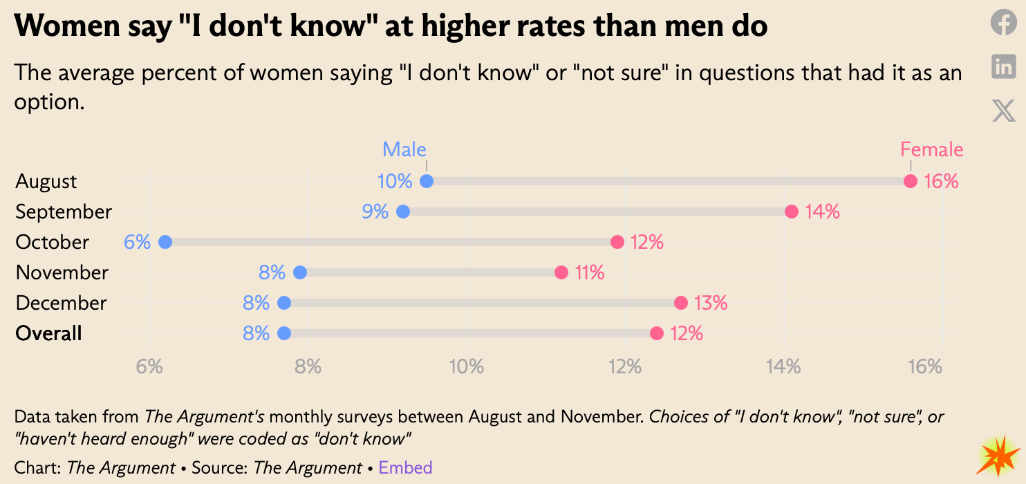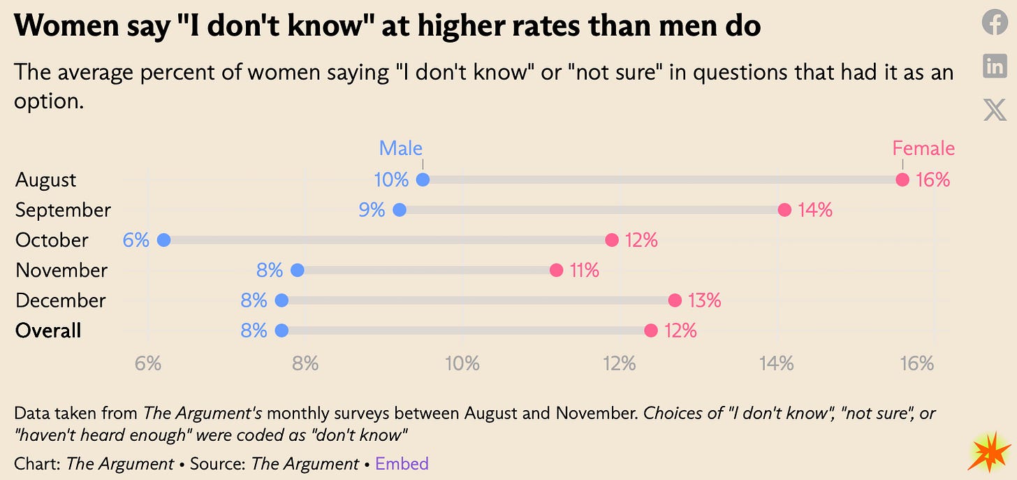 Mansplaining is when men will explain how the world really works, even when they’re not the most informed on a subject. There’s evidence for it in survey research in the lower percentage of men who will say they’re unsure on any given question. The Argument ran the numbers and found that women say they “don’t know” 5% more often on average than men across surveys.