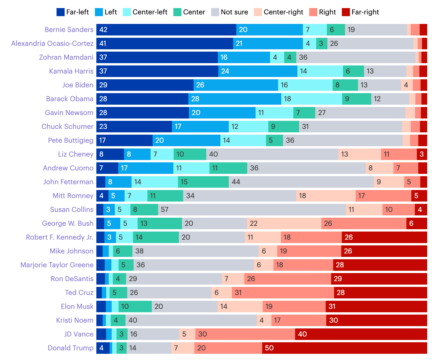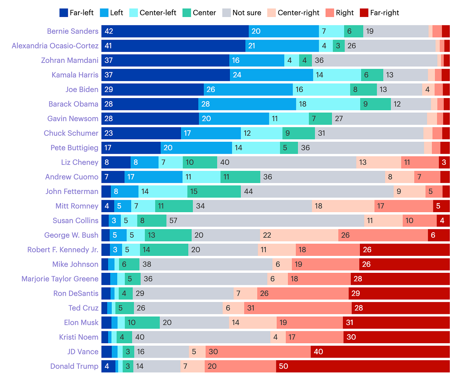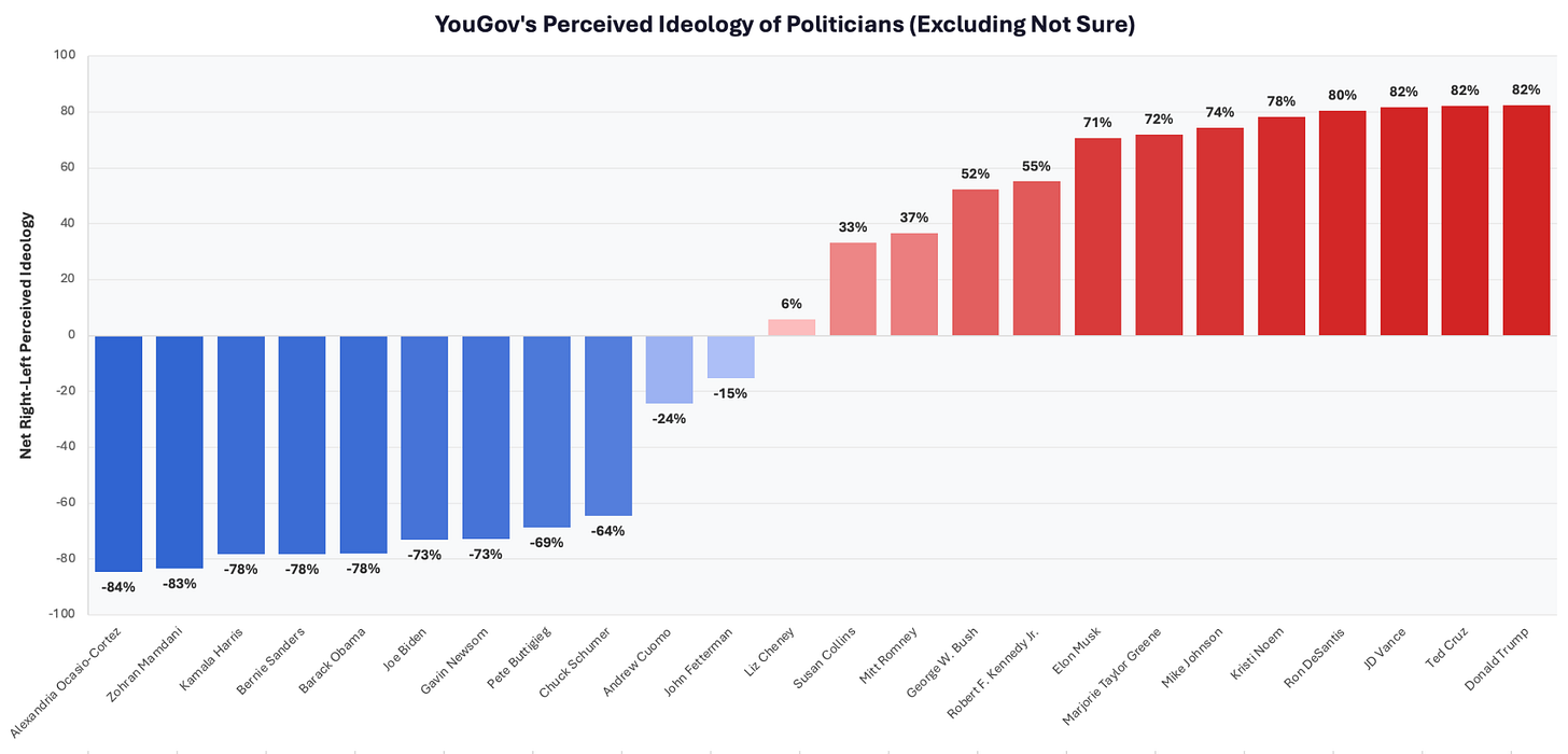 Here’s a chart of the net left-right scores for each politician, excluding respondents who don’t know, which makes the point about the center pretty dramatically. With the exception of John Fetterman and Susan Collins, no national politicians perceived as truly centrist are in office today—and both of those will face tough re-election battles.