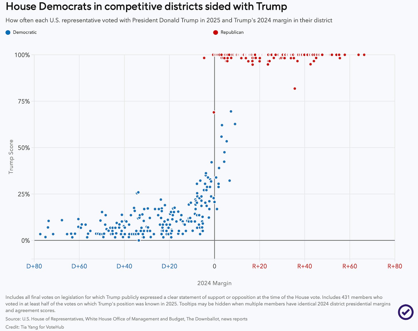 Legislatively, though, things can play out differently. VoteHub’s new Trump Score shows House Democrats siding with Trump more than Republicans breaking with him. But measures like this are susceptible to what kinds of votes occur and when. If you’ll remember, Trump had somewhat of a honeymoon period early in 2025 where Democratic opposition to him was not as strong. It’ll be interesting to see what this looks like in 2026.