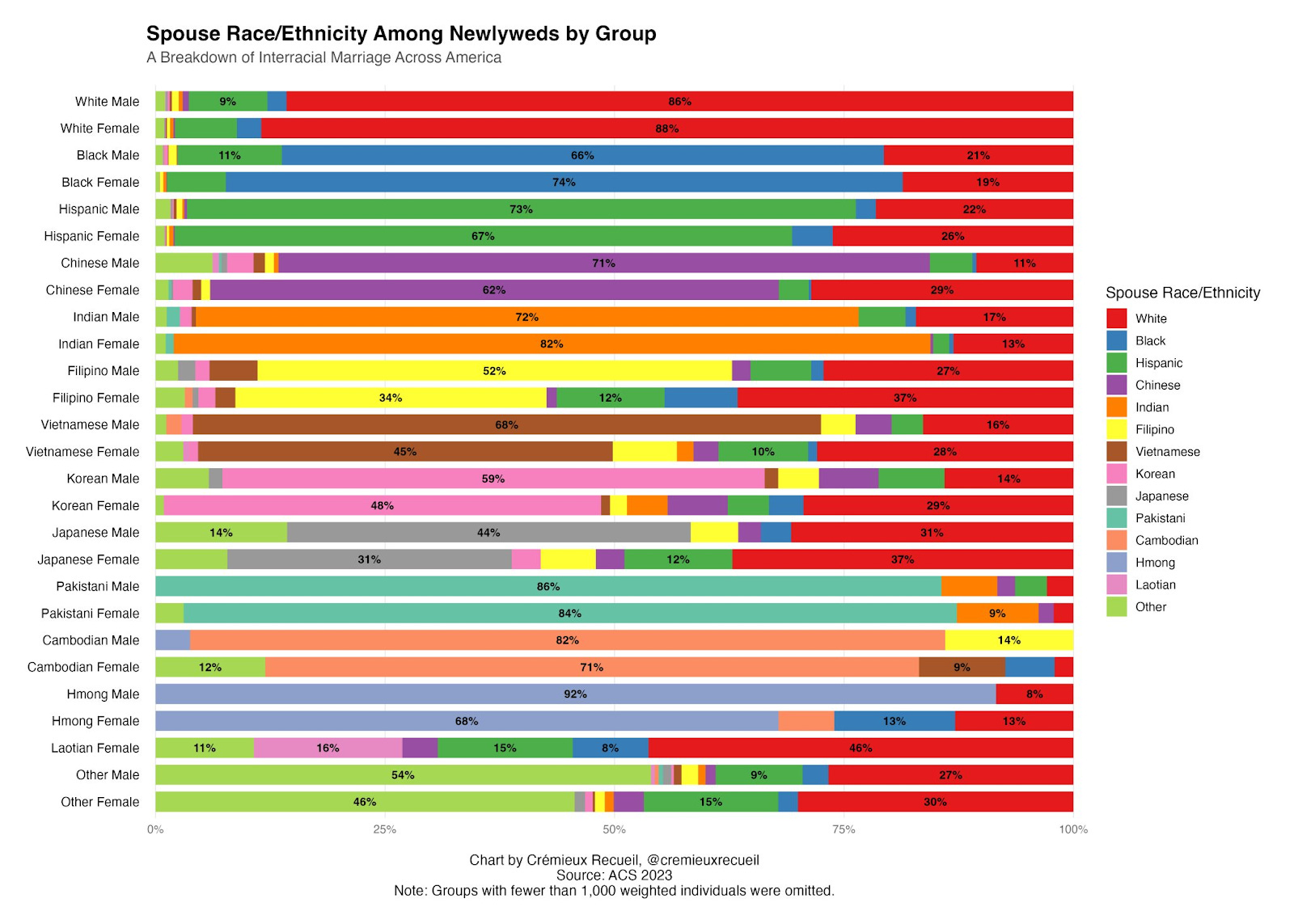 The Marriage chart is kind of interesting. Is this all marriages or just opposite sex ones. If both are there differences between opposite sex & same sex marriages? Another thing is the fact that 26% of Hmong Women are marrying Whites or Blacks & both groups are equal. Its also noteworthy that Hmong Women are after Black People themselves the most likely by % to chose Black Partners. I realize that the gross numbers of Whites or Hispanics choosing Black Partners may be greater than that of Hmong Women.