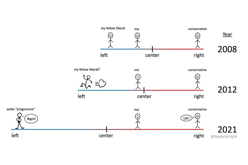 More evidence for the meme Elon Musk likes to share: people in the U.S. on the left have consistently moved further left since 1988 while the right has remained in place.