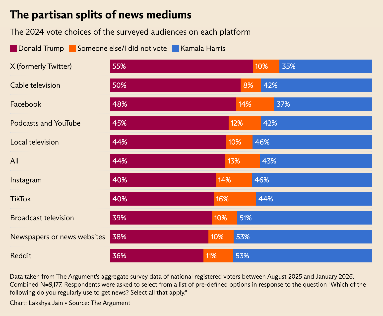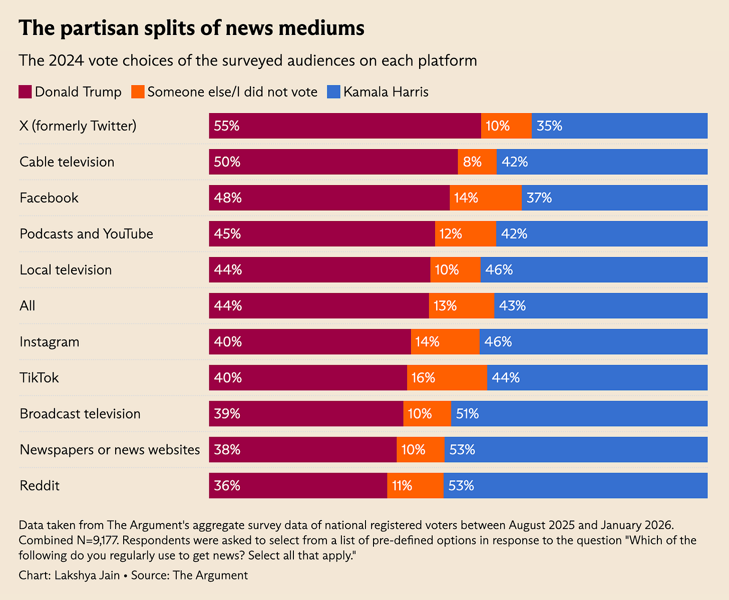 Since Elon Musk’s takeover of Twitter (now X), it’s become the most conservative-coded news source, with users who voted for Trump 55-35. Reddit is the most liberal-coded of all those that The Argument tested, 53-36 Harris. Cable, Facebook, and podcasts/YouTube lean right, TikTok, broadcast TV, Instagram, and newspapers lean left.